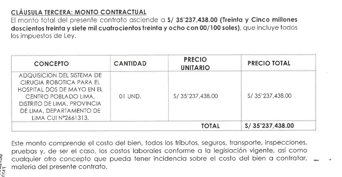 Aunque los contratos en Perú agregan capacitación, mantenimiento y accesorios, la diferencia de precios sigue siendo abismal. Además, el Hospital Dos de Mayo pagó más que el INEN, pese a haber comprado menos insumos quirúrgicos (pinzas, tijeras, grapadoras), los cuales deben reemplazarse dependiendo de su uso y tiempo de vida útil, y representan un gasto recurrente. Y otro dato no menor: la empresa ALEM, que finalmente vendió el equipo al INEN, también participó en la etapa de indagación de mercado. Es decir, fue parte del proceso para identificar posibles proveedores y como solo ella lo ofrecía en Perú, terminó vendiéndolo.