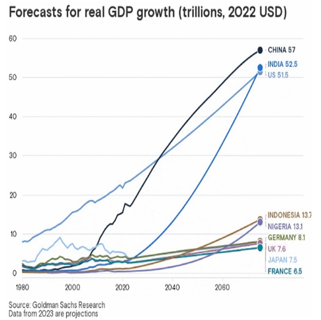 Encontré por ello un pronóstico de crecimiento del PBI de Goldman Sacha para economías de gran tamaño. Adjunto el gráfico a esta nota en que se ve que el PBI chino superara al de los EEUU a fines de la década del 2030.